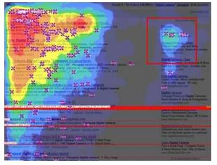 那么如果我们关键词展现量挺大,但点击率太低,那该怎么办?我们还是要先看推广的排名。不管是出价或者是优化创意,我们的关键词排名排在视觉热点区,那么获得点击的可能性就很大,下图是视觉热点图: